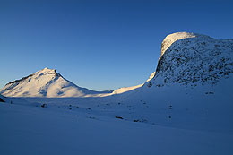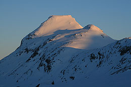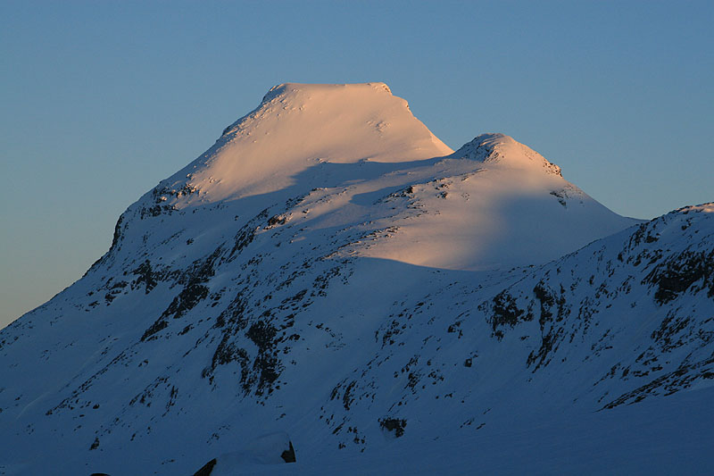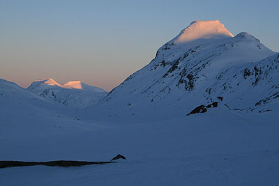 | Vi närmar oss de fantastiska topparna vid Olavsbu | Olavsbu och Stora Rauddalseggi i kvällssol |