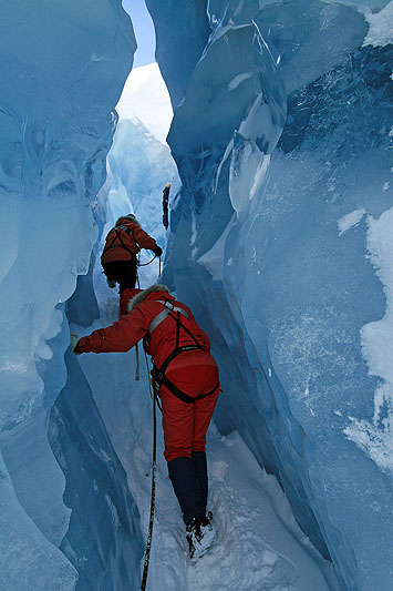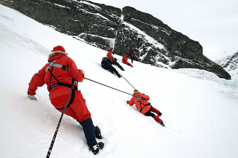 Den sista dagen ägnade vi åt "Äventyrsisen". En tur man ordnade utifrån våra önskningar. Det vill säga en tur upp till Svellnosbreens utlopp. Efter att ha åkt skidor upp i dalen, gick vi till fots uppför en brant moränrygg för att nå glaciären. När glaciären störtar ner i dalen bryts isen sönder och det bildas sprickor och gångar. Inknutna i selar och med rep mellan oss och en guide i spetsen utforskade vi den azurblå eller smaragdgröna isen. Vi fick också uppleva att repen verkligen behövdes, då Ingegerd plötsligt kanade nerför sluttningen. Vi fick hålla emot med all kraft och hon kravlade upp igen. Vi tyckte alla att isvandringen var en upplevelse utöver det vanliga.