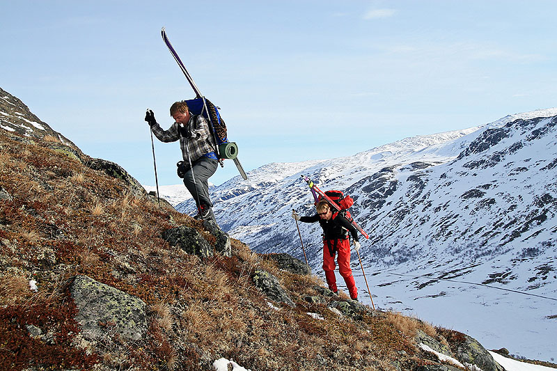 Vi går sedan en tur söderut längs leden mot Fondsbu, upp i det första passet mellan Mjölkedalstind och Sjogholstind och sedan en härlig utförslöpa med lämplig lutning ner mot sjöarna i dalen.