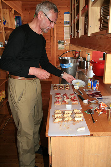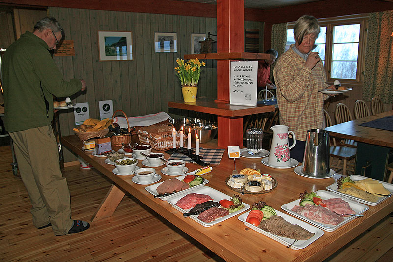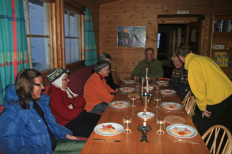 Olavsbu är en självbetjänt stuga, dvs man kan köpa mat ur förråden, men man får laga den själv. Våra skickliga kockar får snabbt till en trerättersmiddag även här. Små läckra snittar framställs av Bengt G, Sigbritt fixar spagetti med pizzafyll-sås och Marie steker pannkakor så att brandlarmet tjuter.