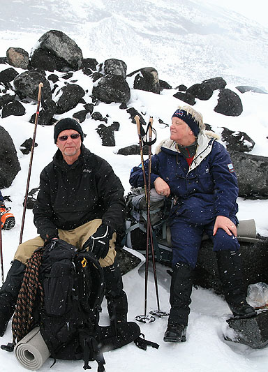 | Bengt och Sigbritt på väg upp för moränryggen | Sven och Ammi vid insteget till glaciären |