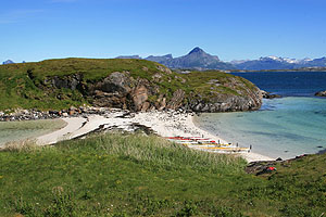 Dagen därpå grydde med strålande, sol, vindstilla och varmt. Vi styrde kosan mot Hestmona (Hästmannen kallad på grund av sin siluett.) Vi gick i land för bad och kaffe på Stora Skarvholmen, en fin ö med en mängd dammar på. Vi drog sedan vidare till Buöya, en ö med övergivna hus, där vi gick iland på en kritvit snäckskalsstrand. Det var lågvatten och vi hade en stund på oss att luncha, innan vattnet åter skulle täcka den fina stranden. Vi paddlade ner mot Geiteröya och inspekterade näset, där det fanns fina tältplatser i båda vikarna, och paddlade sedan längs Hestmonas norra sida och ner på västsidan till en liten vik under Urtinden. Här hittade vi en gräsbevuxen kil som blev vår tältplats. Vi lagade till den fina torsken som Olof hade fiskat.