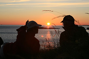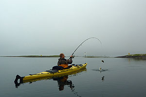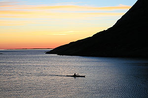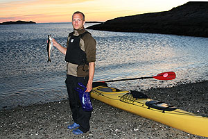 På kvällen fiskade Olof från kajaken och fick ihop till en middag, som vi åt dagen därpå. Vi fick en underbar ljummen kväll med solnedgång i havet kl 24. (Midnattssolen var förbi för det här året).