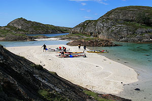 Rödöyas västsida visar upp en mängd fina små stränder, men först längst upp i norr hittade vi vår favoritstrand, med en liten kulle som en udde ut i havet. Innan vi hittat denna favoritplats under det branta Rödöyafjället var vi rejält trötta. Det är lätt att dagarna blir långa, när det är ljust dygnet runt. Dagen därpå ägnade vi oss åt Rödöya en lummig ö med många fina sandstränder. Vi besökte gästhamnen, där det fanns både dusch och café och en stor affär. En stor del av gänget besteg sedan Rödöylöva, den stora klippan som kan se ut som ett lejonhuvud från havet betraktat. Vi hade tur med vädret här, tropisk värme +20°, vindstilla. Fantastisk utsikt västerut bort mot Traena och Lovund, två kända siluetter mot horisonten.