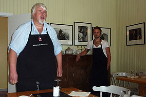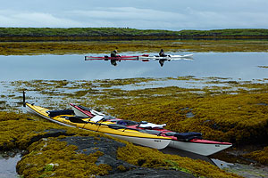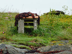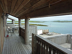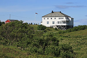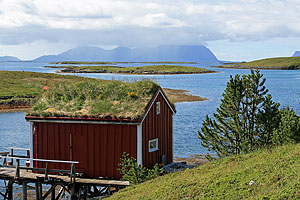 På morgonen blev vi sena till start, och tidvattnet hann gå långt ut innan vi var klara. Det blev mycket bärande, och vi tappade Sigbritts kajak i stenskravlet. Inte så lyckat….en stor skada strax under bakre packluckan. Lagades med tape. Sedan återvände vi dyngsura till Havnomaden, där det nu var fullt av paddlare. Vi hyrde in oss på Husvaer i en lägenhet, och kunde på kvällen besöka Kråkeböllens café, ett trevligt ställe nere vid vattnet. (Kråkeböll=Sjöborre) Vi beslutade att bryta här och ännu en gång ta bilarna för att åka ner mot Sandnessjöen. Därifrån tog vi sedan Hurtigbåten mot Skogsholmen som är en del av Vega Världsarv. Världsarvet bygger på den kultur, där befolkningen levt i samklang med naturen och fått sin utkomst av den. En viktig del är att man hållit ejdern som ”husdjur”, genom att bygga lämpliga boplatser, små ejderhus med tak, där man sedan kunnat samla in ägg och dun. Den gamla skolan med internat på Skogsholmen är omgjord till vandrarhem. Här härskade Stein med sonen Kristoffer. Stein är kock och bjöd på fantastiska måltider med lokala specialiteter. Vi var dom enda gästerna.