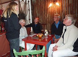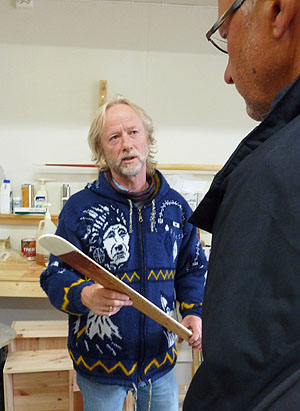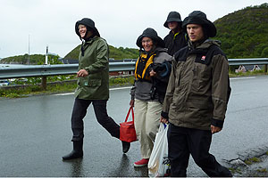 Vi beslutade att kosta på oss att ta in yr.no på mobilen. Huvaligen, dom lovade plötsligt riktigt busväder, som skulle komma in nästa morgon. Nu var klockan 12 på natten och vi hade en bra bit in till fastlandet. Valet stod mellan att stanna på denna gudsförgätna plats, kanske flera dagar, eller att bryta upp och försöka ta oss iland. Det blev det senare. Kl 2 på natten bröt vi lägret och gav oss iväg. Det var tämligen lugnt, men en ihärdig motström gjorde att vi färdades ganska sakta. När vi, efter 15 km paddling, kom till den fina småbåtshamnen i Tonnes hade vädret blivit betydligt sämre. Vi var tacksamma för att kunna utnyttja det lilla servicehuset i gästhamnen till dusch och matlagning och betalade glada vår hamnavgift. Här hade vi också bilarna parkerade under turen. Heléne och Sven hade nu bestämt sig för att åka hem. Övriga ville hemskt gärna åka ner till Havnomadens kajakcenter. När vi väl satte oss i bilarna blåste det 17m/s och regnade på tvären. Kustvägen ner mot Heröy var dramatiskt vacker, men vädret förtog en del av upplevelsen. Vi passerade Helgelandsbron, ett fantastiskt byggnadsverk, och tog sedan några färjor ut mot Husvaer och Havnomaden. Havnomaden var, precis som jag anat från andras beskrivningar, helt fantastiskt. En ombyggd fiskfabrik, med övernattningsmöjligheter och självhushåll på övre våningen, på nedre våningen Pub, konferenslokal, kajakverkstad, samt bostad för Bent och Inge Skauen som äger och driver stället. Bent och Inge tog varmt emot oss och berättade om verksamheten. Vi fick se hur Bent bygger kajaker och grönlandsåror i sin verkstad. Vi fick två fina dagar här, då vi shoppade runt och även besökte Tone Toft och Björn Ökern, två andra kajak- och Helgelandsentusiaster. Tone är konstnär och hade eget galleri här ute.