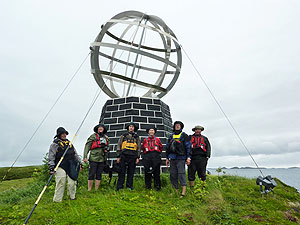 Till slut beslutade vi oss för att ge oss iväg trots att det fortfarande blåste en del. Vårt första mål var Vikingen och polcirkelmonumentet där det obligatoriska gruppfotot togs. På kvällen fick vi uppleva vårt första lågvatten. På platsen vi fann fick vi bära kajakerna långt. En vacker plats med fjällvegetation och den största ansamling av Fjällbrud jag någonsin sett. Följande dag paddlade vi vidare norrut. Lite svårt att hitta rastplatser var det, stränderna var branta och steniga, och mot slutet var det både motvind och stark motström. Vi paddlade på så gott vi kunde, men GPS:en visade en fart på 3 km/h.