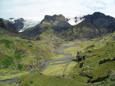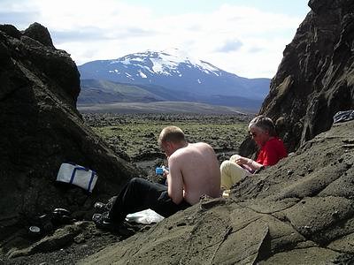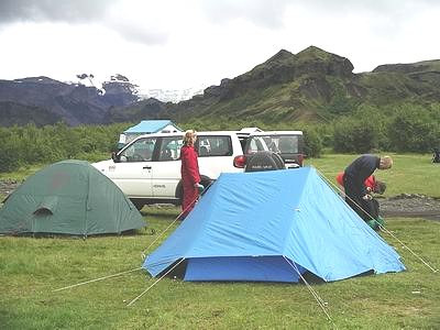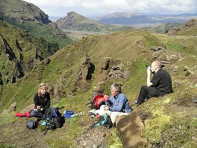 | Mýrdalsjökull (Krossárjökull) and Tungnakvist | Coffe break in Godaland, Thorsmörk behind |