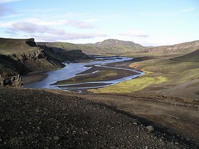 Bláhnúkur rhyolit-coloured mountain to the left and Laugahraun lava field |