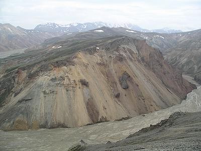 | Climbing Bláhnúkur mountain, old lava field and camp site below | View of Landmannalaugar colourful mountains |