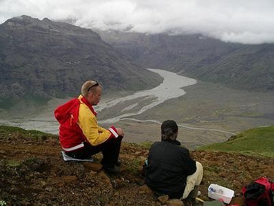 | Coffe break with view of Kjós | Morsardálur and Morsarjökull in dull weather |
