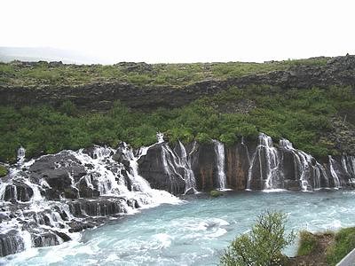| Hraunfossar, water from the lava fields well up into Hvitá river | Kaldidalur route to Reykjavík, Thórisjökull behind |