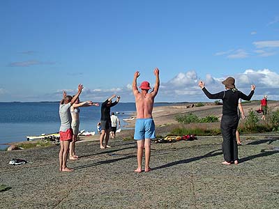 Den sedvanliga öpromenaden, och en stretching ledd av Emelie, följs av