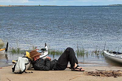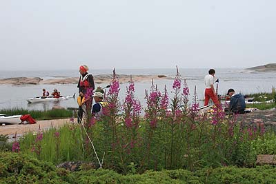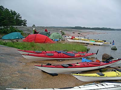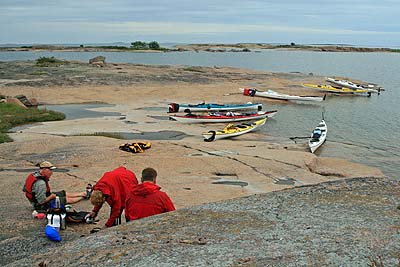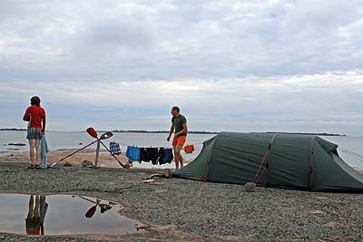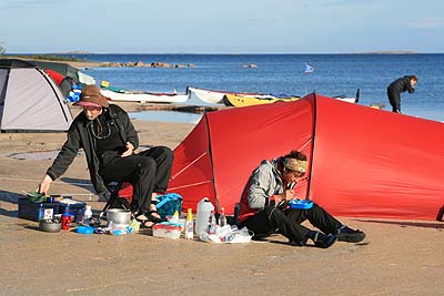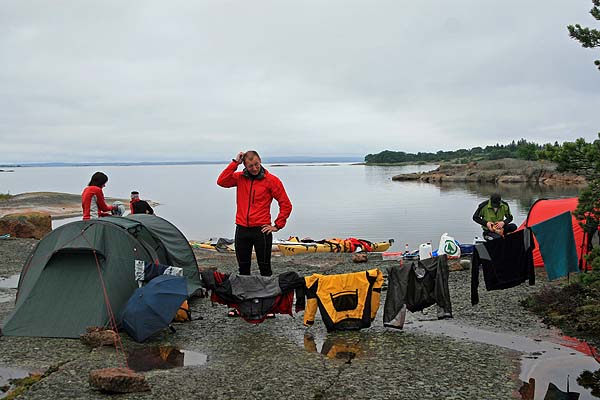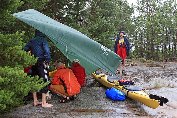 arrangera vindskydd, med medhavda presenningar, och släpar glatt upp kajaker som
