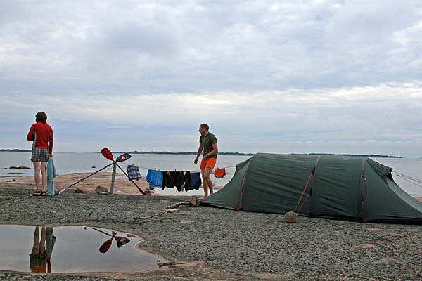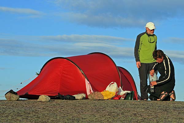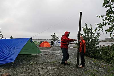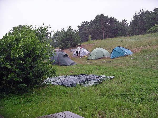 tälta vid hamnen på nordsidan. Regnet vräker ner, när vi sätter upp tälten.