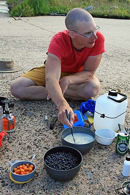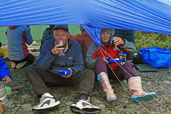 mer skyddad väg tillbaka till tälten. På kvällen kan vi äta utan regnskydd.