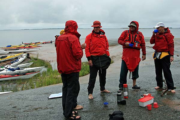 | Regnig och kall rast på fin udde | Värmande kaffe |